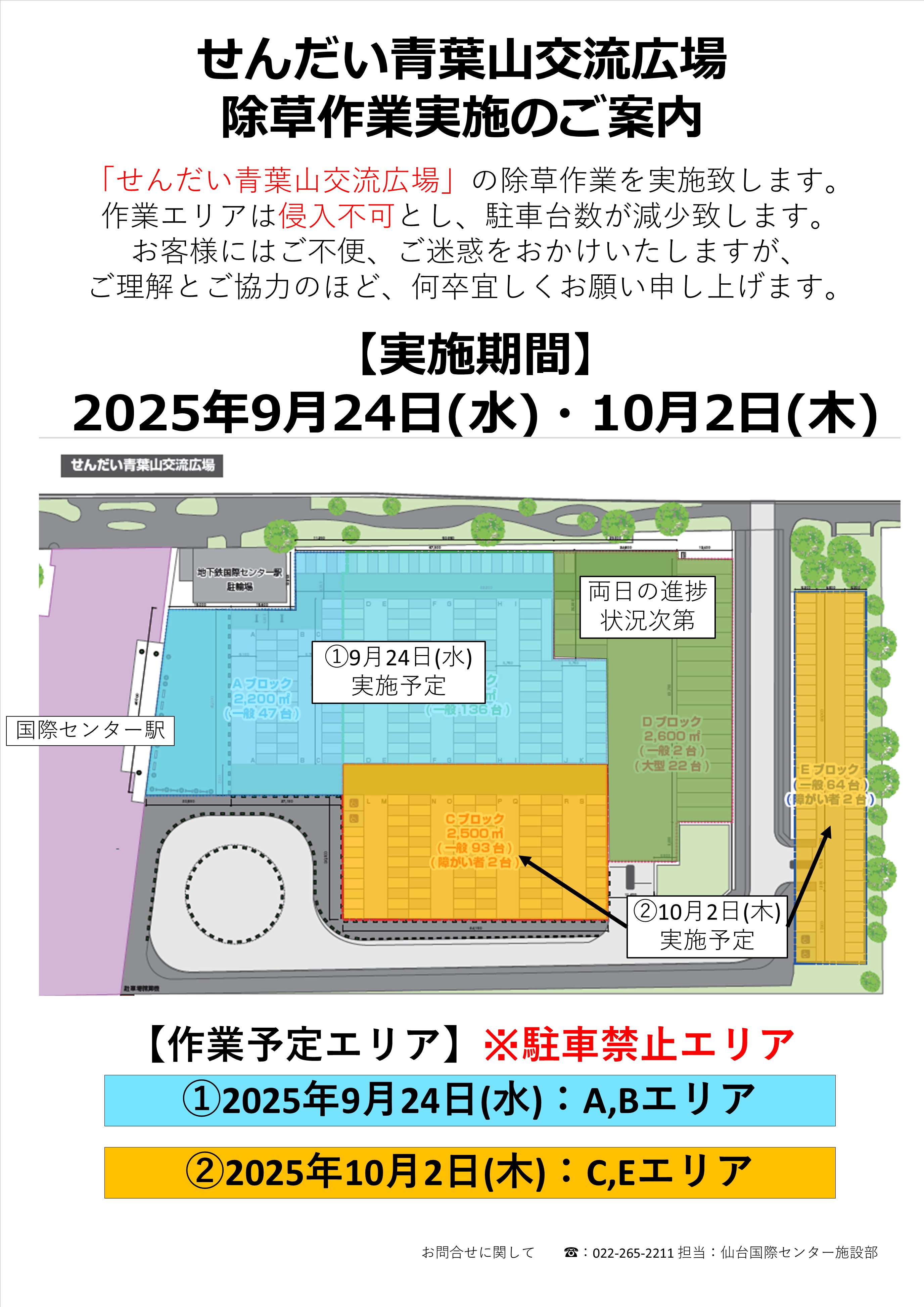 除草実施エリアにつきましては進入不可とさせていただき、作業を実施いたしますので日によって駐車台数が減少いたします。